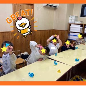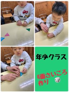 少し前の取り組みですが、年少クラスのレッスンでサイコロ作りをしました🎲